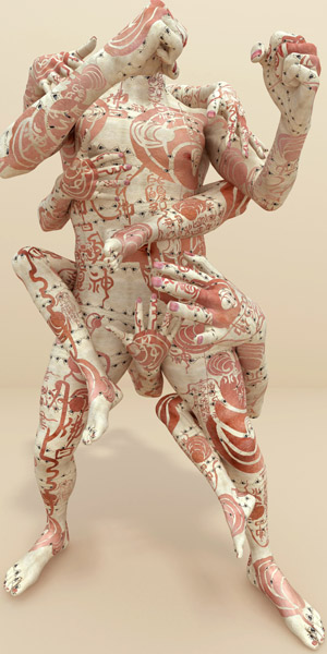 Mi interessano I tatuaggi come metafora di un desiderio nascosto o una sorta di pulsione imprigionata nella coscienza umana. Io vedo la pelle, o in alcuni casi il monitor, come un’estensione della tela. I miei primi dipinti-tatuaggio erano tele tridimensionali a forma di grumi di carne o parti del corpo, come braccio muscoloso. I tatuaggi possono riflettere una realtà individuale o collettiva o un desiderio deviato.