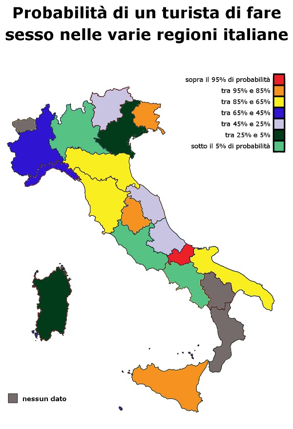 Volete sapere quante probabilità avete di fare sesso se decidete di andare in vacanza in una qualsiasi regione italiana? Per gli uomini arriva la mappa composta da Oltreuomo, nella quale attraverso una legenda dai semplici colori viene mostrata senza paura e senza peli sulla lingua quella che è la possibilità di entrare in intimità. (Mappa dopo il salto)