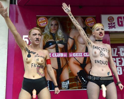 Proprio a Kiev le belle Femen hanno approfittato del bagno di folla per togliersi le magliette e sfoggiare seni nudi pieni di scritte in lingua e peni finti sui pantaloni, quasi a voler dimostrare una doppia immagine, una più forte e coraggiosa e una più provatrice e provocante.