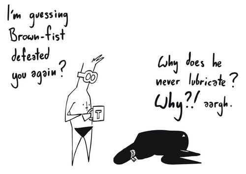 Infatti Fetishman tocca una vasta gamma di temi, non solo il BDSM, in una cornice che mescola feticismo e lotta al crimine, come farebbe un vero supereroe. E i nemici di Fetishman sono soprattutto le suore, il furry fandom, la censura, i butt plug (evidentemente poco apprezzati dallo stesso Geof), la mentalità vittoriana di molti inglesi, la fantascienza che piace tanto ai geek , e naturalmente il tè, bevanda preferita del suo creatore ma qui messa alla berlina come “droga più venduta d’Inghilterra”.