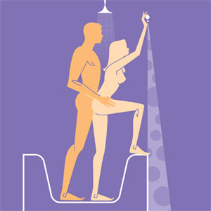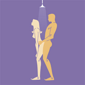 Immagine 3: Entrambi sotto il getto d’acqua. Lei di schiena dovrà cercare un punto di appoggio e sollevare la gamba destra. Lui la penetrerà da dietro aiutandosi con le mani, entrambe posizionate sul bacino di lei, nella spinta. Lei potrà aggrapparsi in alto per aiutare la spinta di lui mentre il partner potrà accarezzarle il pube con una mano.