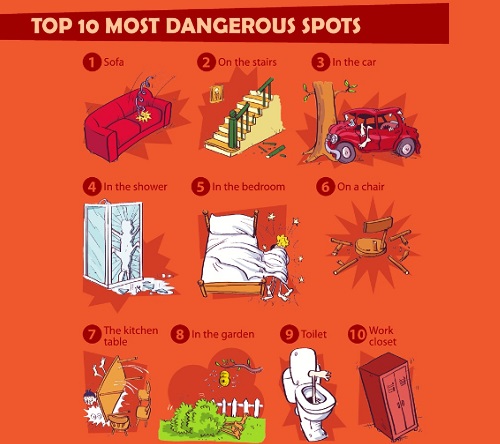 Cosa ne pensate dell’infografica? Se vi va, raccontateci la vostra esperienza. Qual è il posto più “pericoloso” in cui avete fatto l’amore? Quale luogo della vostra casa, o dell’esterno, vi ha fatti tornare a casa con un acciacco? E ancora, per quali oggetti avete dovuto offrire banali spiegazioni dopo averli mandati in mille pezzi e gettati nella spazzatura?