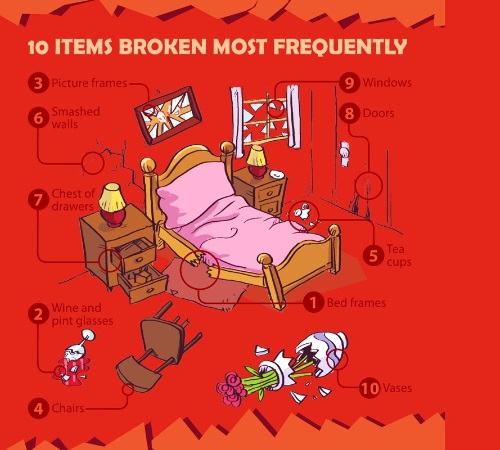 Quali sarebbero invece gli oggetti rotti con più frequenza durante il sesso? La prossima infografica (la trovate nella nostra gallery al fondo dell’articolo), mostra tutto ciò che spesso siamo obbligati a buttare via a causa della focosa passione che accende il nostro desiderio… Nella top ten degli oggetti più rotti durante il sesso troviamo, nell’ordine: le assi del letto, i calici di vino, le cornici, le sedie, le tazze per la colazione, le pareti di casa (addirittura? Brutti sporcaccioni!), i cassetti, le porte, le finestre e i vasi.