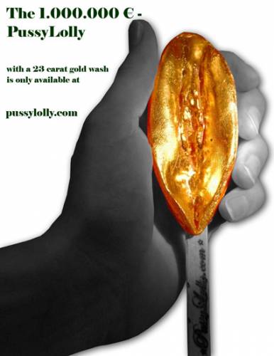 Il Pussy Lolly però nasconde due altre varianti che sono sicuramente ancora più originali, una con il piercing (un piccolo gioiello che chiude con eleganza le piccole labbra) e una versione mestruazione che invece vede uscire dalla vulva un filo azzurro, il cordoncino del tampax. Siete rimasti a bocca aperta? E non avete ancora sentito la vera sorpresa… Il Pussy Lolly, venduto per una modica cifra di circa 17 euro (il modello normale costa 6,90, il modello mestruo 9,90 e il modello piercing costa 16,90), offre un’altra versione davvero speciale: il Pussy Lolly in versione dorata, una grande riproduzione della vagina da esporre nella credenza di casa come un gioiello prezioso. Il suo prezzo è infatti di 1.000.000 € ed è stata realizzata con oro a ventiquattro carati e la vagina preziosa verrà consegnata personalmente dai produttori in un cofanetto preziosissimo.