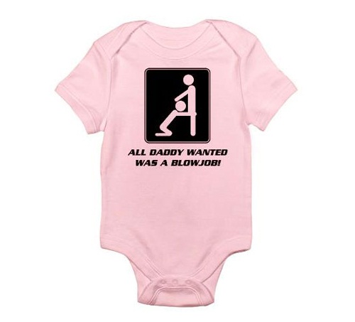 Tra tutte quelle che abbiamo collezionato, la tutina vincitrice della gallery è sicuramente quella che abbiamo inserito in apertura al nostro post: una morbida tutina rosa per la nanna che recita candidamente “Mio padre voleva solo un po’ di sesso orale!”.