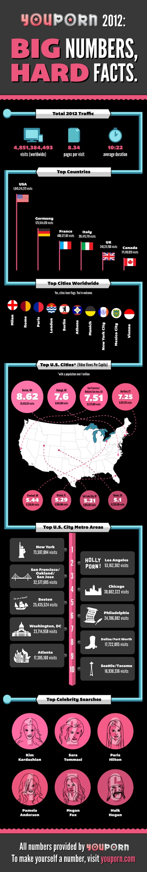 Davanti a noi solo Stati Uniti, Germania e Francia. Il che la dice davvero lunga, anche se in quanto a smanettamenti (in ogni senso, N.d.R.) Milano e Roma superano anche Parigi. Che si sia alla ricerca di buon materiale masturbatorio o del filmino da vedere cazzeggiando con gli amici, YouPorn è davvero il top della categoria. E’ stato il sito stesso a diffondere le proprie statistiche. Magari non le farà piacere, ma sapete chi c’è al secondo posto tra i più ricercati nel sito? La nostra Sara Tommasi. Seconda solo all’onnipresente Kim Kardashian e davanti addirittura a Paris Hilton. Ve lo sareste aspettato? Gustatevi l’infografica a margine dell’articolo.